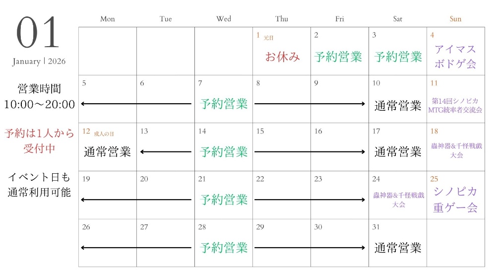 営業日変更で1/3,1/31はお休みとなります。
